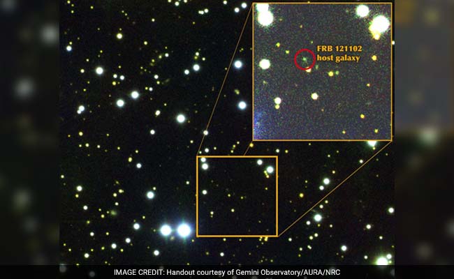 Next, scientists at the Gemini Observatory in Hawaii trained their optical telescope on the speck nailed down by Chatterjee. Their scan of the sky revealed that FRB 121102's source is 2.5 billion light years away, within a very faint dwarf galaxy with about 1 percent of the mass of the Milky Way.