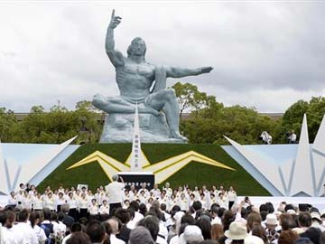 People listen to chorus during a ceremony in front of the Statue of Peace at Nagasaki Peace Park to mark the 69th anniversary of the world's second atomic bomb attack, in Nagasaki, southern Japan Saturday, Aug. 9, 2014.