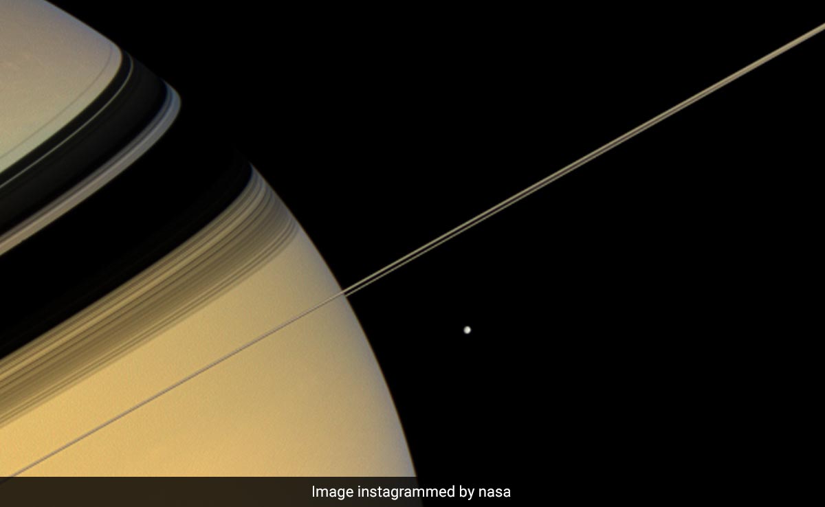 The National Aeronautics and Space Administration (NASA) recently shared an extraordinary picture of Saturn and its moon Mimas on Instagram. The stunning image was captured by its Cassini spacecraft from around 5,76,000 miles (9,27,000 km) away.