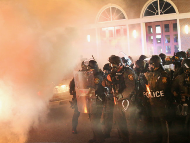 Police guard the Ferguson police department as rioting erupts following the grand jury announcement in the Michael Brown case (AFP)