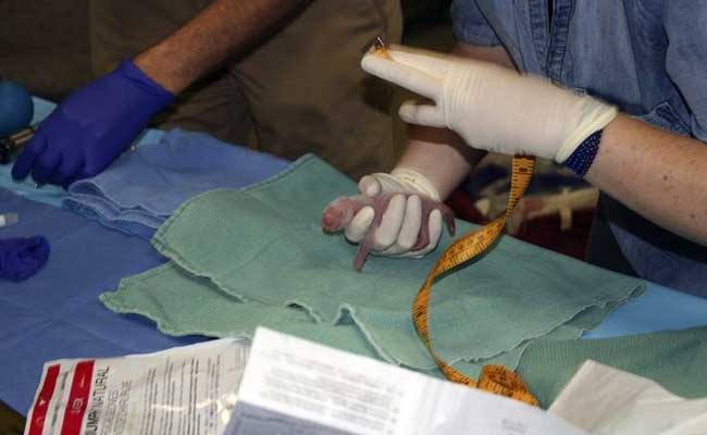 One of the giant panda cubs born on at the Smithsonian's National Zoo in Washington, DC is being examines by veterinarians in this image taken on August 22, 2015. (Reuters)