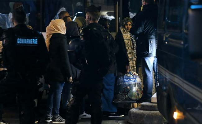 Migrants and refugees queue to get in a bus as they are evacuated by police officers and gendarmes from a makeshift camp. (AFP Photo)
