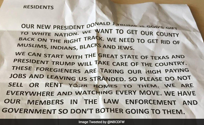 The flyer read, "Our new President, Donald J Trump, is God's gift to the white nation. We need to get rid of Muslims, Indians and Jews," telling them to "get out of Texas and go back to where you came from".