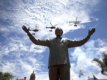Helicopters perform a flypast as smoke rises from a gun salute after the unveiling of a 9 metre bronze statue of former South Africa President Nelson Mandela outside Union Buildings in Pretoria, South Africa, Monday, Dec. 16, 2013.