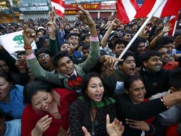 Supporters of Nepali Congress Party cheer for their party as Constituent Assembly Election scores are displayed on a screen outside the Constitution Assembly Building in Kathmandu November 20, 2013.