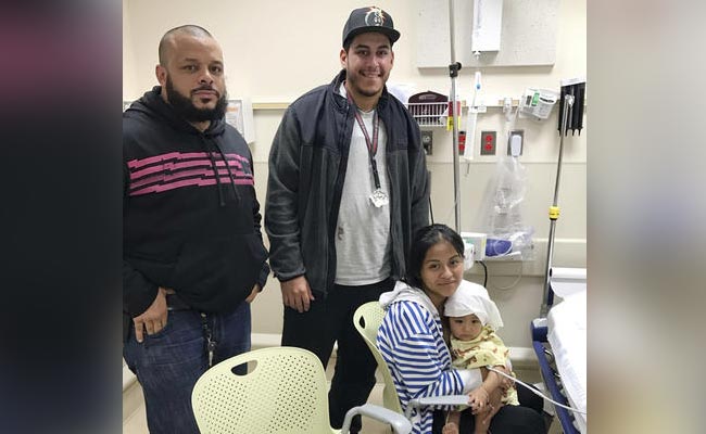 Felix Baez (L) and Giovanni Laguna pose with one-year-old baby Ashley Dolores whom they saved.