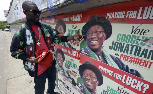 File Photo: A man points to campaign posters of Nigerian President Goodluck Jonathan on March 21, 2015. (Agence France-Presse)