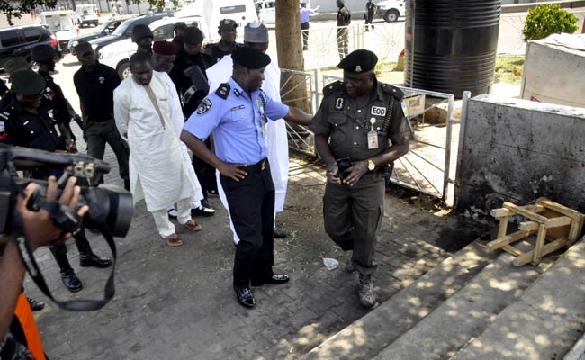 An explosive ordnance device police officer and the Kano State police commissioner inspect the scene of Monday night's bombing by a female suicide bomber at Aliyu bin abi talib mosque in Kano, Nigeria on July 7, 2015. (Reuters)