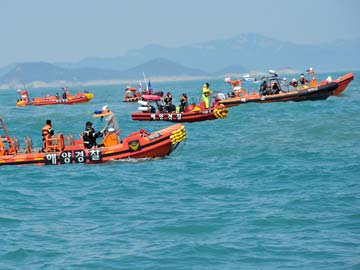Rescue members search for the missing passengers of the sunken South Korean ferry 'Sewol' at sea off Jindo on April 20, 2014.