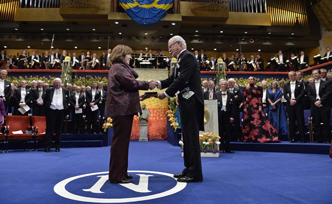 2015 Nobel literature laureate Svetlana Alexievich receives the award from King of Sweden.