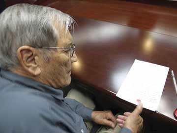 U.S. citizen Merrill E. Newman puts his thumbprint on a piece of paper, after being taken into custody by North Korea, at an undisclosed location in this undated photo released by North Korea's Korean Central News Agency (KCNA) in Pyongyang