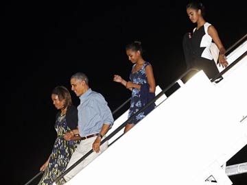 Obama, with wife Michelle and daughters Malia and Sasha, along with Marian Robinson, Mrs. Obama's mother, emerged from Air Force One in casual garb after a 9 1/2 hour flight. First dogs Bo and Sunny were also present.