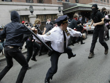 In this May 1, 2012, file photo, a police lieutenant swings his baton at Occupy Wall Street activists in New York.