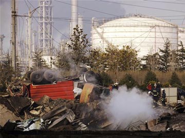 The explosions ripped slabs of pavement and online photos showed bodies, overturned vehicles and shattered windows in nearby buildings. Black smoke rose above gigantic fuel silos and darkened much of the sky over a bay area.