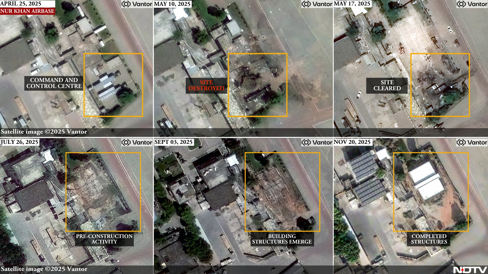 A sequence of events from April 25, 2025, to November 20, 2025, of Pakistan's Nur Khan Airbase. The first image shows two special purpose vehicles (SPVs) which were destroyed on May 10. The site has since been cleared with two completed structures now visible in satellite images. High-res image here