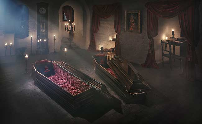 After a candlelit dinner, the visitors will then be shown to their night's resting place -- two large velvet-lined coffins.