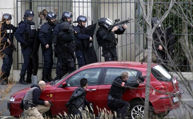 French Research and Intervention Brigades officers prepare near the post office where an armed man is holed up with two hostages. (Photo AP)