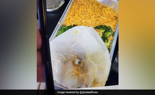 The gruesome image showed what appeared to be a dental implant wrapped in a white napkin. It is pictured alongside an in-flight meal consisting of rice and some vegetables.