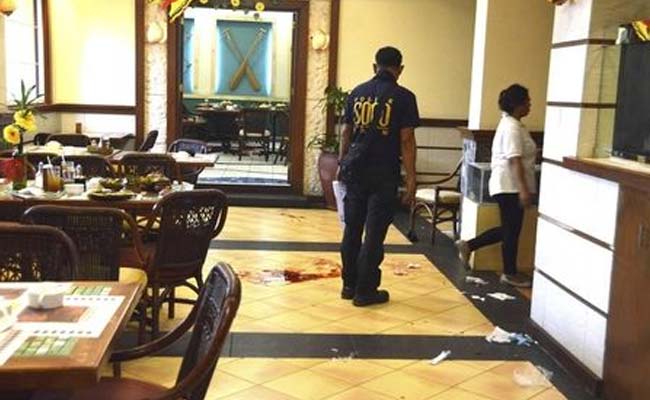 A police investigator surveys the blood-stained floor at the Lighthouse restaurant, where three Chinese diplomats were shot, in Cebu city, central Philippines. (Reuters Photo)