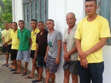 Nine Chinese fishermen, part of 11 detained on May 6, 2014, stand outside the provincial prison in Palawan, Puerto Princesa, western Philippines, as they await trial, May 14, 2014.