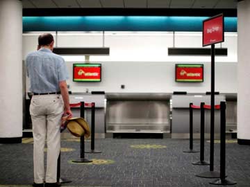 A Virgin-Atlantic passenger talks on a mobile phone at the airline counter in Miami's international airport, Florida on April 20, 2010