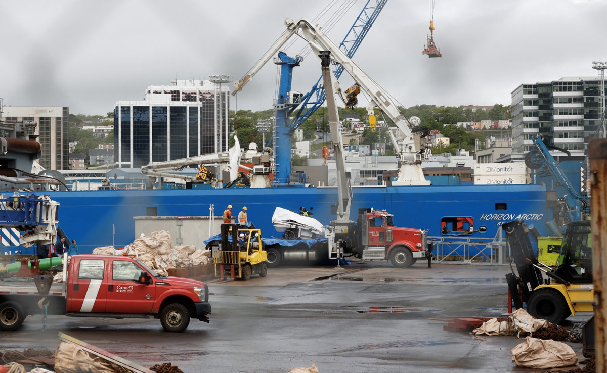 Video from the Canadian Broadcast Corporation showed what appeared to be the nose of the submersible and other shattered fragments wrapped in white tarp pulled up by a crane off the Horizon Arctic vessel at the St. John's harbor in Newfoundland on Wednesday morning.