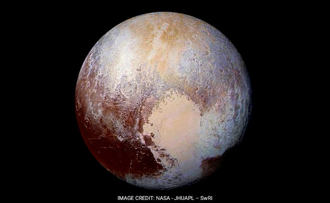 An exaggerated color photo shows the varied terrain of Pluto, the most well-known dwarf planet.