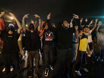 People defy a curfew Sunday, Aug. 17, 2014, before smoke and tear gas was fired to disperse a crowd protesting the shooting of teenager Michael Brown last Saturday in Ferguson, Mo. Brown's shooting in the middle of a street following a suspected robbery o