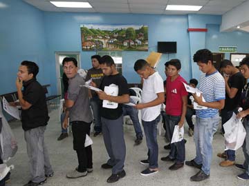 Deportees line up to fill immigration forms at a centre after arriving on an immigration flight from the US, at the international airport in Honduras