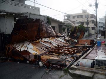 In the capital Naha, traffic lights went off and television footage showed trees split by the force of the storm, signboards flying around and a restaurant destroyed, with the shattered building blocking a street.