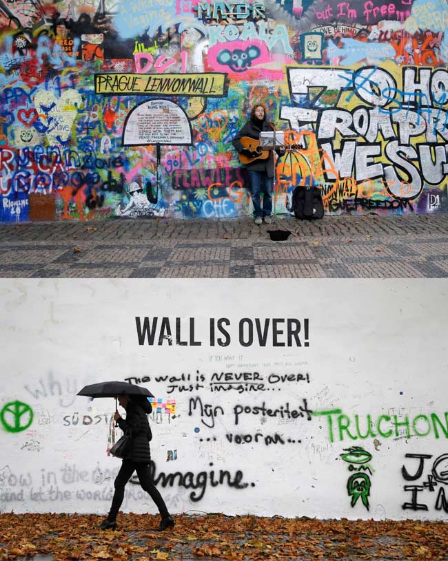 This combination photo shows Prague's "Lennon Wall" on October 29, 2014 (Top) and on November 18, after it was painted white in Prague. (Associated Press)