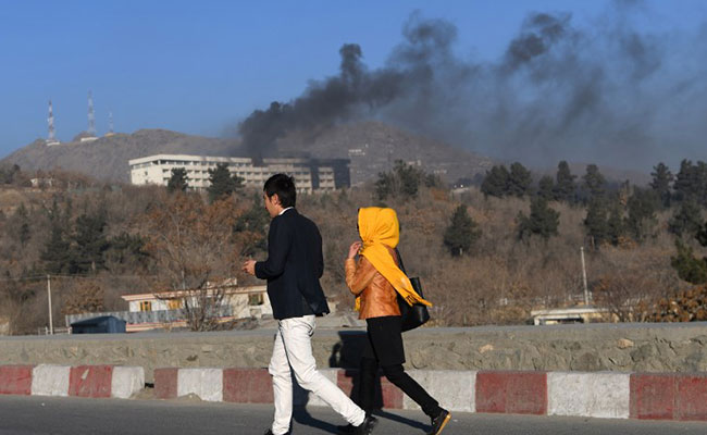 Afghans walk near the Intercontinental Hotel as smoke billows from the hotel (AFP)