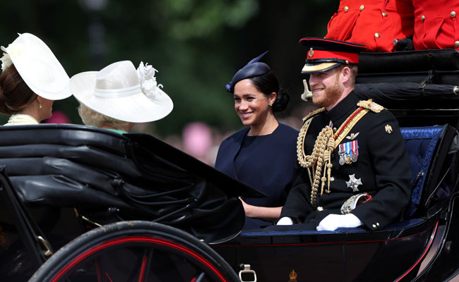 Britain's Prince Harry and his wife Meghan were among members of the royal family to attend an annual military parade in honour of Queen Elizabeth on Saturday - Meghan's first official royal engagement since the birth of her and Harry's son Archie.