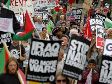 Demonstrators with placards join an anti-war protest march in Newport, August 30, 2014 ahead of the upcoming NATO summit.