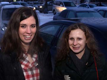Two members of anti-Kremlin punk band Pussy Riot, Nadezhda Tolokonnikova (L) and Maria Alyokhina smile as they meet in the airport of the Siberian city of Krasnoyarsk.