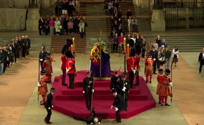 Dramatic scenes were witnessed in the Palace of Westminster when a guard keeping vigil next to Queen Elizabeth's coffin collapsed and fell off the podium.