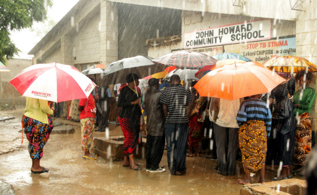 Zambian voters brave heavy rain as they stand in line waiting to cast their ballots at a polling station at the John Howard Compound, during presidential elections, on January 20, 2015. (AFP)