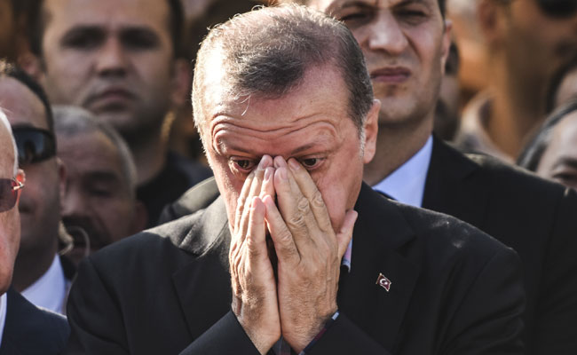 Turkish President Recep Tayyip Erdogan broke down in tears while speaking at the funeral of an old friend in Istanbul killed during the coup, images from Turkish television showed.