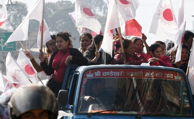 Nepal communist party supporters participate in a victory rally in Kathmandu (AFP)