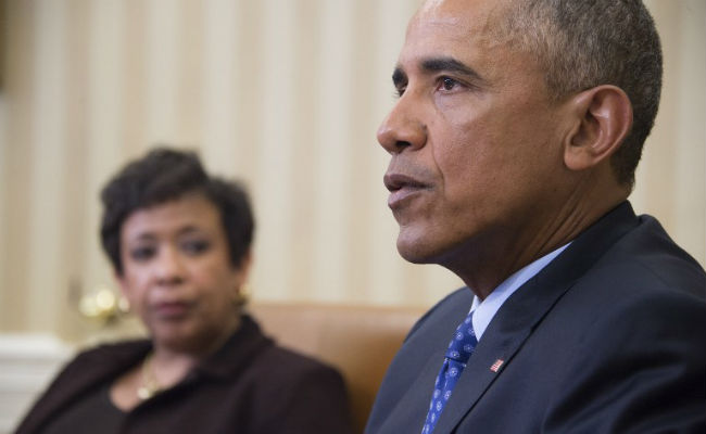 US President Barack Obama speaks with Attorney Genral Loretta Lynch in the Oval Office of the White House in Washington, DC, on January 4, 2016. (AFP Photo)