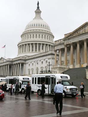 Senate Democrats load into buses before departing the Capitol for a meeting with US President Barack Obama in Washington
