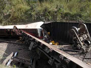 This picture taken on April 22, 2014 shows derailed wagons after a train sped off the rails 65km north of Kamina, in the southern province of Katanga, Democratic Republic of Congo.
