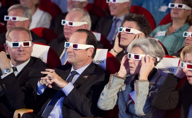 French President Francois Hollande ,center, wears 3D glasses as he attends broadcast of the Rosetta mission of the comet in Paris on November 12, 2014. (AFP)