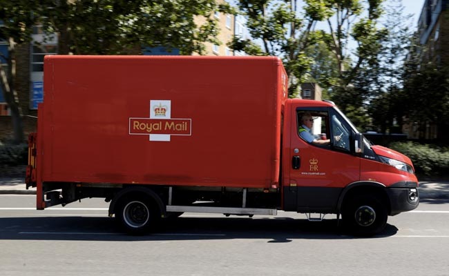A Royal Mail delivery vehicle drives along a road in London.