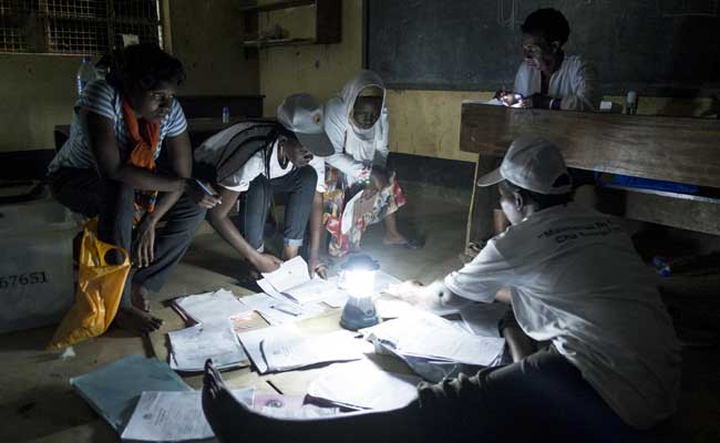 Election workers prepare to count ballots after presidential and general elections using an electric lamp to light the space at a polling station in Dar es Salaam on October 25, 2015. (AFP)