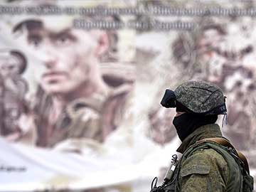 A Russian soldier stands in front of a recruitment poster for the Ukrainian armed forces in an area surrounding the Ukrainian military unit in Perevalnoye, outside Simferopol, on March 20, 2014.