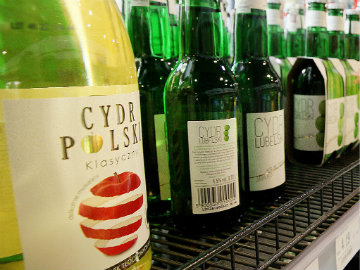 Bottles of Polish cider sit on a shelf in a small store in Warsaw