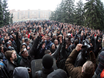 Pro-Russia supporters take part in a hand vote during a rally outside the regional police building in the eastern Ukrainian city of Horlivka (Gorlovka), near Donetsk. (File photo)