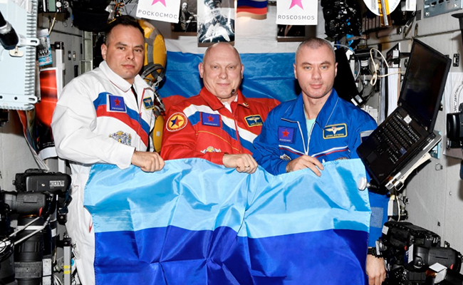 The agency posted pictures of cosmonauts Oleg Artemyev, Denis Matveev and Sergei Korsakov smiling as they held up flags of Russia's proxies in eastern Ukraine, the self-proclaimed Luhansk People's Republic and Donetsk People's Republic.