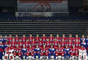 ice team poses in the Lokomotiv Arena in the city of